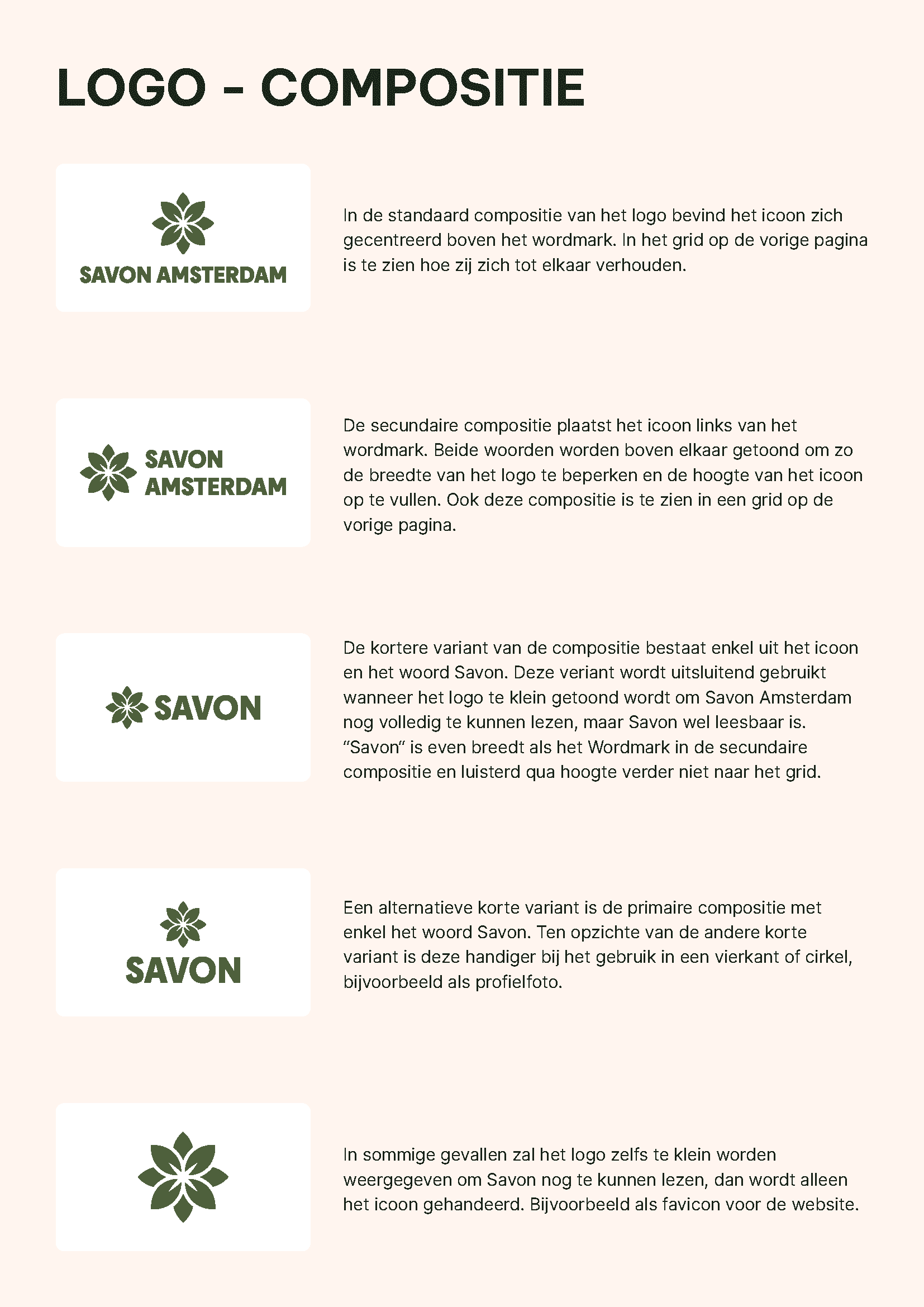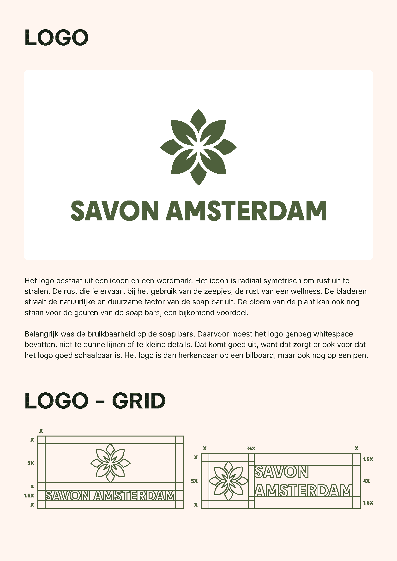 Samen met Chiel en Max ontwierpen we een fijn en helder brandbook. Dit bevat een stijlvol logo met slimme variaties, een warm kleurenpalet en stevige typografie. Alles is gericht op het uitstralen van de duurzame en luxe sfeer waar Savon voor staat. Zo kan het merk straks overal consistent en krachtig zijn verhaal vertellen, van verpakking tot online.