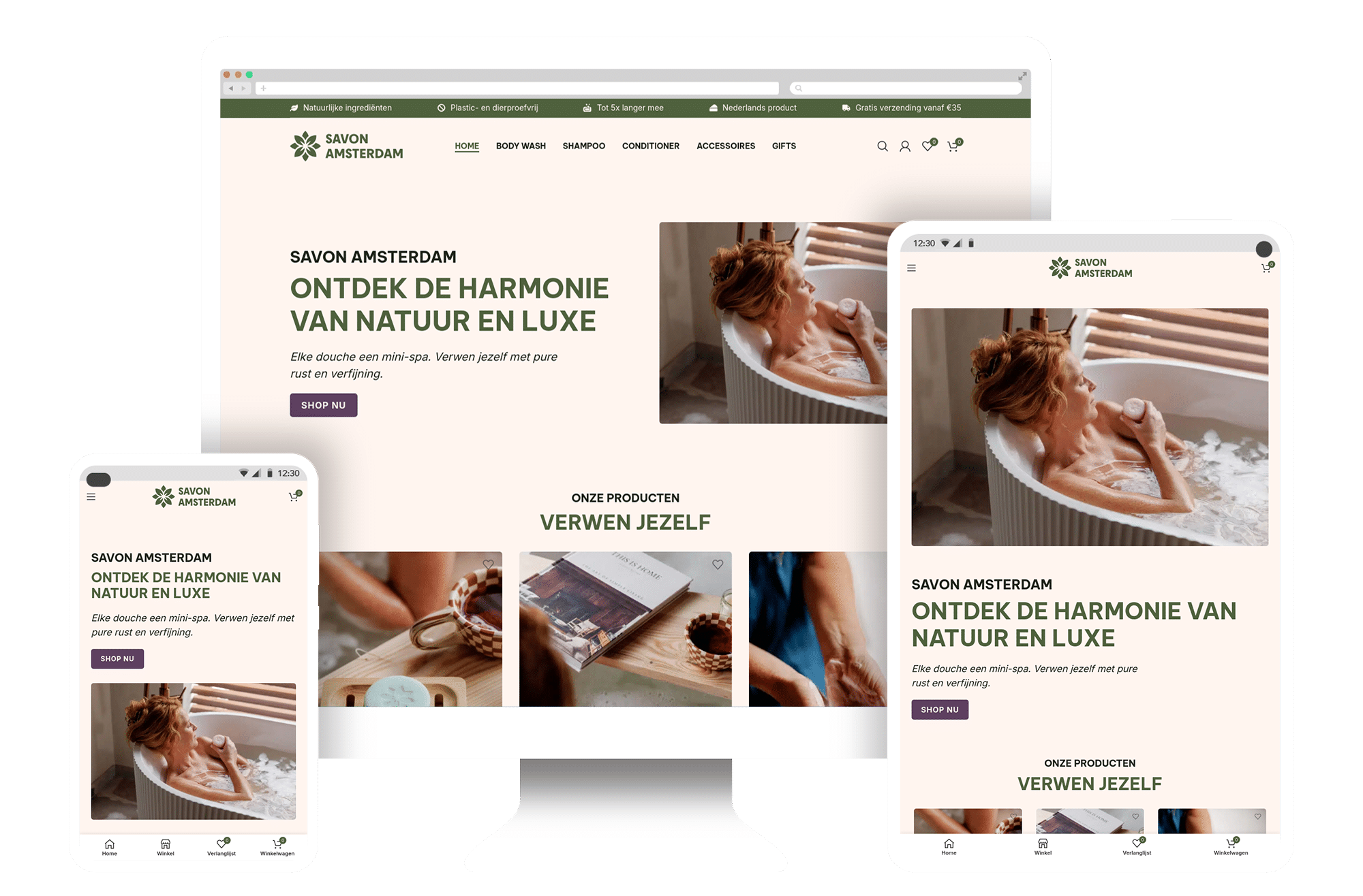 Voor Savon Amsterdam realiseerden we een webshop die de duurzame missie en luxe uitstraling van het merk tot leven brengt. Savon biedt plasticvrije verzorgingsproducten, zoals shampoo bars en body bars, allemaal gemaakt met natuurlijke ingrediënten en een oog voor het milieu.