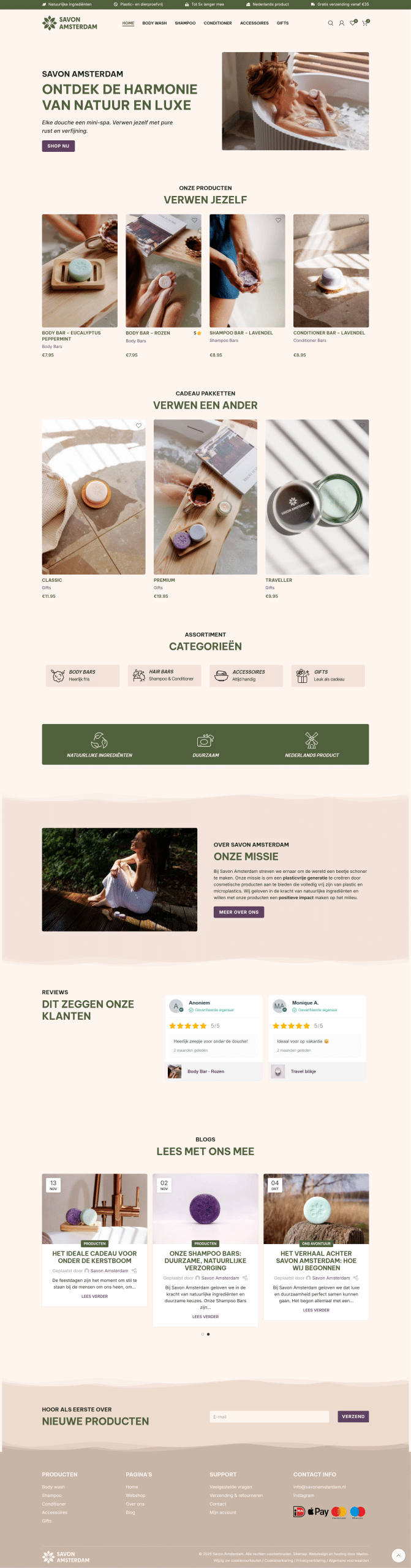 Op de website draait alles om helderheid, sfeer en gemak. Met een overzichtelijke navigatie, warme visuals en persoonlijke teksten voelt het meteen vertrouwd. Bezoekers vinden snel alle producten, kunnen eenvoudig shoppen en ontdekken het verhaal achter Savon. De branding, die eerder door ons is ontwikkeld, komt subtiel terug in het kleurgebruik en de typografie, zodat alles één geheel vormt.